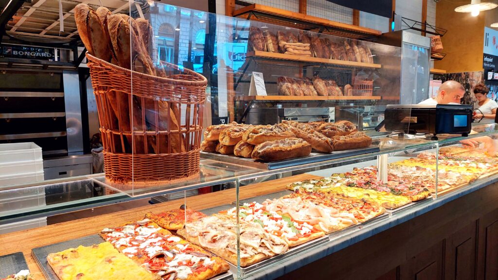 Zostało Wam trochę czasu do odjazdu pociągu lub autobusu, więc nie chcecie oddalać się od dworca, ale coś byście jednak zjedli? W południowej części dworca Termini znajduje się Mercato Centrale – food hall z ofertą na każdy gust. Przy samym wejściu znajdziecie całkiem smaczną pizzę na kawałki (uwaga, cena jest podawana za kilogram, a te kawałki potrafią swoje ważyć!), ale najciekawsze stoisko ukryte jest w głębi hali. Trapizzino to włoska odpowiedź na zagraniczne fastfoody – trójkątny pieróg smażony w głębokim tłuszczu, a następnie faszerowany wybranym nadzieniem. Testowaliśmy parmigianę (bakłażan, pomidor, pesto, mozzarella) i klopsiki w sosie pomidorowym – każda sztuka kosztuje 4 euro, jest przyrządzana na Waszych oczach i jest pysznym pomysłem na śniadanie czy przekąskę w ciągu dnia!
