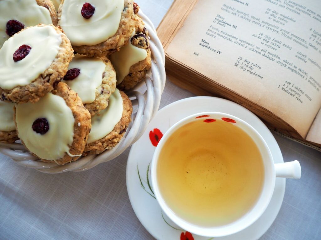 Chociaż żurawinowe ciastka owsiane nie brzmią szczególnie atrakcyjnie, a wręcz podejrzanie dietetycznie, zdecydowanie warto się przy nich na chwilę zatrzymać. Rozkosznie maślane, kwaskowate dzięki pomarańczy i żurawinie, delikatnie orzechowe i przyjemnie chrupiące za sprawą migdałów, a do tego oblane cienką warstwą białej czekolady. Ciastka są naprawdę banalnie proste w przygotowaniu, a przepis daje całkiem spore pole do popisu dla kulinarnej fantazji i jest dobrą okazją na spożytkowanie różnych resztek czających się na dnie szuflad. Żurawinę można zastąpić np. suszonymi śliwkami czy nawet rodzynkami, zamiast migdałów dobrze sprawdzą się też orzechy laskowe, a jeśli bardzo dbamy o linię, to można zrezygnować z czekolady – bez niej żurawinowe ciastka owsiane będą równie smaczne!